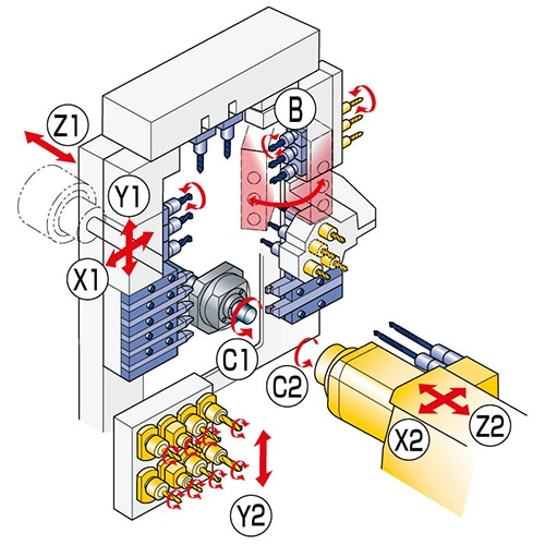 La SR-20RIV-E s’impose comme une machine véritablement polyvalente. Dotée d’une cinématique et d’un outillage similaires à ceux de la SR-20RIV Type B, elle assure avec élégance la transition entre les opérations d’usinage simples et complexes, et optimise la production comme jamais auparavant. L'une des caractéristiques clés du modèle E est le porte-outil programmable sur l'axe B, qui permet un contrôle simultané sur 4 axes. Ceci autorise des opérations d'usinage plus complexes, offrant ainsi aux utilisateurs une plus grande flexibilité de production. La machine est également dotée du système de guidage transversal exclusif de Star sur le porte-outil à plusieurs bras. Cette conception améliore la rigidité en réduisant la charge sur les rails de guidage pendant la coupe, garantissant ainsi une précision durable et des performances stables même dans les environnements de production les plus exigeants.